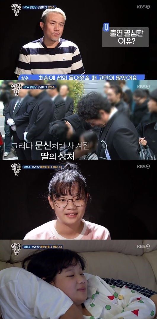 특히 김성수는 '살림남2'에 출연한 이유에 대해 "사실 고민이 많았다. 혜빈이 엄마 사건도 있었지 않았나"라며 지난 2012년 사망한 전 아내를 언급한 뒤, "혜빈이가 학교를 갔는데 친구가 그 사건을 인터넷에서 보고 '너희 엄마 칼 맞아 죽었다며?'라고 했다더라. 정말 화가 많이 났지만 일단 딸을 안정시키는 게 중요했고, 그런 걱정도 있었지만 우리가 어떻게 사는지 궁금해하시는 분들에게 잘 살고 있다고 보여드리고 싶어 출연을 결심했다"라고 설명해 이해를 돕기도.