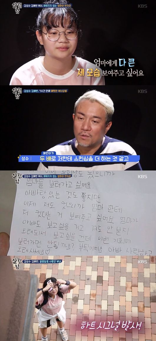 그룹 쿨 김성수가 딸의 모습을 최초로 공개했다. 어느덧 13살이 된 김혜빈은 부회장이자 아빠에게 애교를 피우는 사랑스러운 모습이었다. 하지만 김성수와 딸 사이에는 쉽게 극복하지 못할 상처가 남아있었고, 그 상처는 13살 딸을 너무나 성숙하게 만들었다.