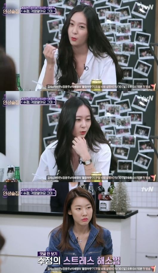 정수정은 '걱정이 많은게 고민'이라 털어놨다. 정수정은 "작품에 들어가기 전에 고민을 많이 한다. 나는 늘 최악을 생각한다. 긍정적으로 생각하면 혼자 기대를 너무 많이 할 것 같더라"고 말했다. 또 정수정은 "차가운 이미지로 오해받는 게 어릴 땐 속상했다. 어릴 땐 그런 말을 듣고 악플도 달리다보니 상처를 받았다. 하지만 이젠 신경 안 쓰게 됐다. 그러면서 마음이 편해졌다. 그래서 사람도 좀 피하게 됐다"고 밝혔다.