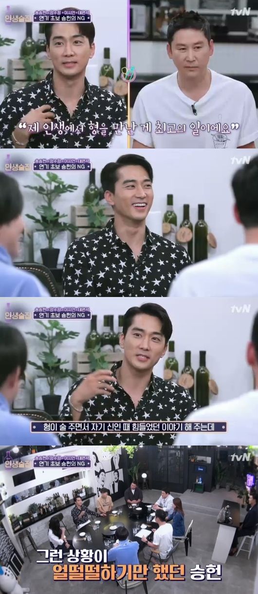 이어 송승헌은 "우연한 계기로 배우가 돼 남들이 보기엔 복에 겨워 보였겠지만, 당시엔 카메라가 나를 빨아들인다는 생각이 들 정도로 힘들었다. 한 테이크에 NG만 100번을 냈던 것 같다. 이 일은 내 길이 아니라 생각했다. 그 때 신동엽이 손을 내밀어줬다. 나를 집으로 데려가서 신인 때 힘들었던 이야기를 해주는데 그 상황이 얼떨떨했다. 그게 너무 고마웠다. 내 인생에서 신동엽을 만난게 최고의 일이다"고 말하며 애정을 드러냈다.