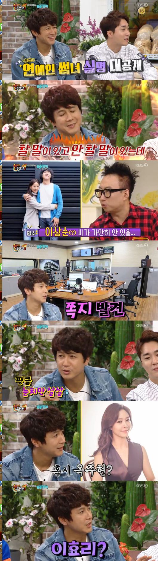 이어, 이효리가 따라다녔단 일화를 전했다. 라디오 DJ 시절, 김승현은 "걸그룹과 친해지기 마련이다, 핑클이 게스트로 출연한 날, 화장실 간 사이 쪽지가 놓여있었다"면서 '우리 멤버 중 널 좋아하는 멤버 있다'는 쪽지였다고 했다. MC들은 "공소시효 지난 얘기다, 괜찮다"면서 계속해서 얘기를 이끌었다.