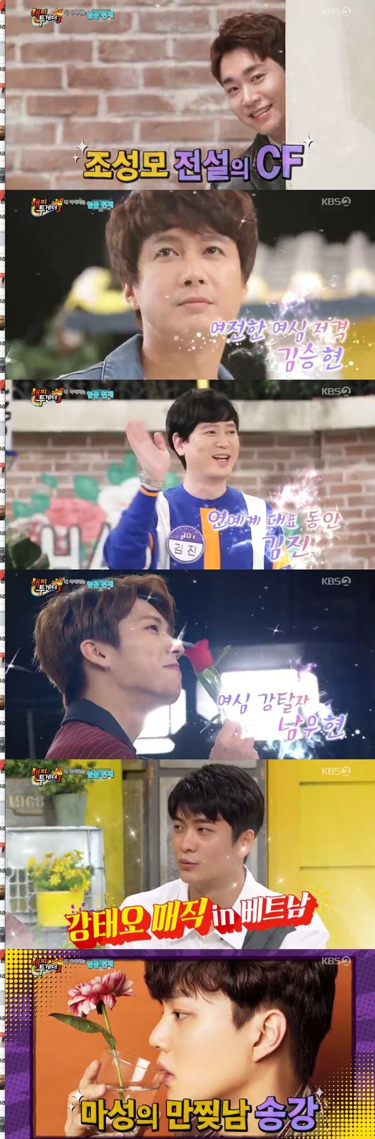 27일 방송된 KBS2TV 예능 '해피투게더 시즌3'에서 내 아이디는 얼굴천재 특집으로 조성모, 김승현, 강태오, 김진, 남우현, 송강이 출연했다.