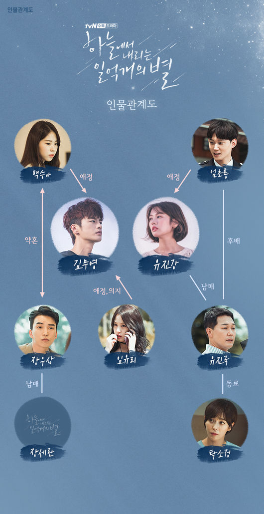 '하늘에서 내리는 일억개의 별' 속 인물들의 얽히고 설킨 관계를 흥미진진하게 그려낸 ‘운명관계도'가 공개됐다. 특히 서인국-정소민 사이의 빈 공간은 향후 두 사람이 어떤 충격적 운명으로 얽힐지 궁금증을 증폭시킨다.