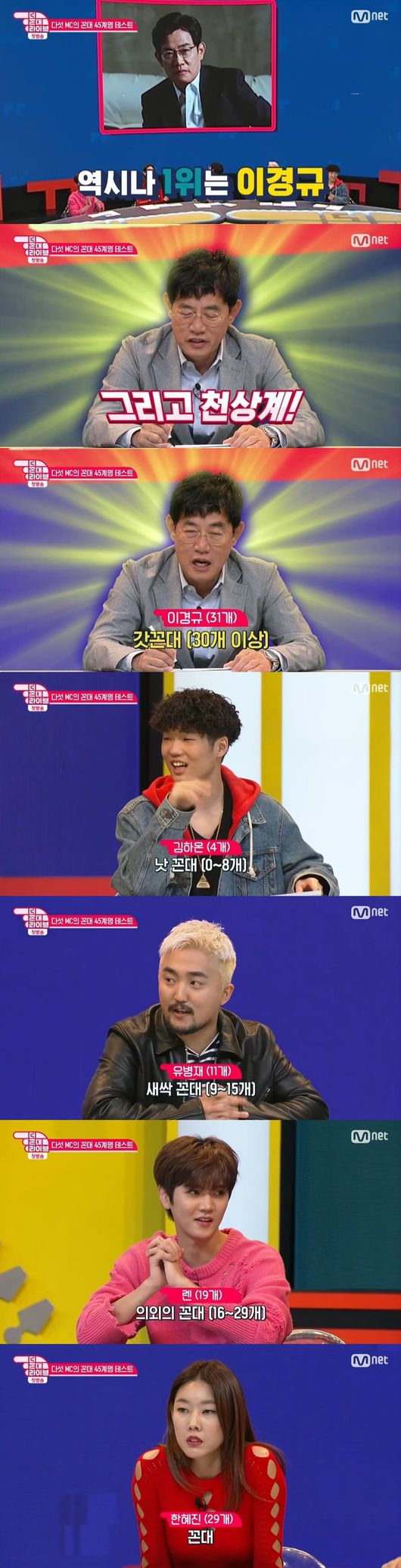 28일 오후 방송된 케이블채널 tvN '더 꼰대 라이브'에서는 이경규, 한혜진, 렌, 유병재, 김하온이 '꼰대 45계명 테스트'를 진행했다.