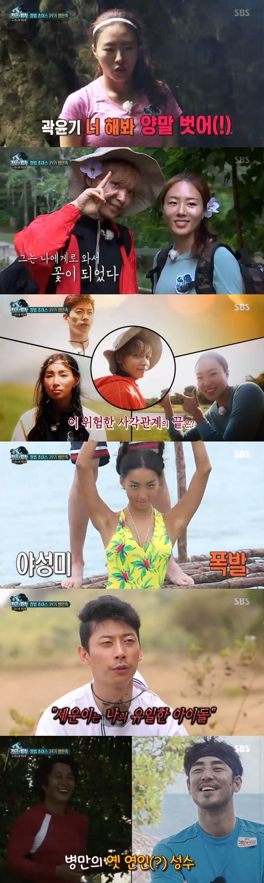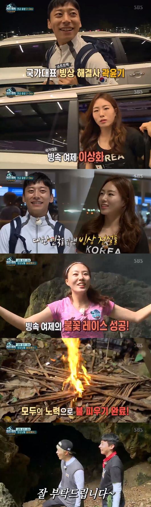 세 사람의 앞에는 동굴이 펼쳐졌다. 이상화는 “정신 차리고 똑바로 내려와라”라며 두 남자를 이끌었다. 이상화는 “동물 사체 썩는 냄새가 난다”고 말했고, 동굴에는 곽윤기와 강남이 앞장섰다. 강남은 “지붕을 안 만들어도 된다. 불만 켜만 된다”며 동굴에서 숙박할 것을 제안했다. 그러나 이들에게는 랜턴이 없었다. 직접 불을 피워야 했던 것. 곽윤기는 시합 때 쓰는 일명 ‘개구리 장갑’으로 불을 피웠다. 모두의 노력으로 불은 피웠으나 횟불을 만들려면 헝겊과 기름이 필요했다. 이상화는 “곽윤기 양말 벗어”라며 윤기의 양말로 헝겊처럼 사용했다. 기름은 이상화가 늘 들고 다니던 바세린을 사용했다. 동굴 안에는 바퀴벌레, 박쥐가 가득했다. 강남과 곽윤기를 대신해서 이상화가 횟불을 들고 앞장 섰다. / besodam@osen.co.kr