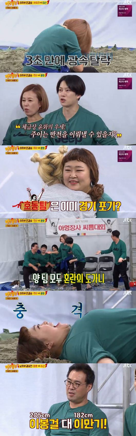 이 분위기 몰아, 홍윤화와 이수지의 대결이었다. 명불허전 빅매치였다. 각각 이만기와 강호동에게 지도를 밭으며 샅바를 잡았다. 엄청난 힘으로 홍윤화가 이수지를 제압, 회전으로 중심을 무너뜨린 후 제대로 승리했다. 민경훈은 "씨름 방송 보는 줄 알았다"면서 감탄했다. 엄청난 경기를 보여준 두 사람이었다. 이로써 홍윤화가 1승을 거머쥐었다.