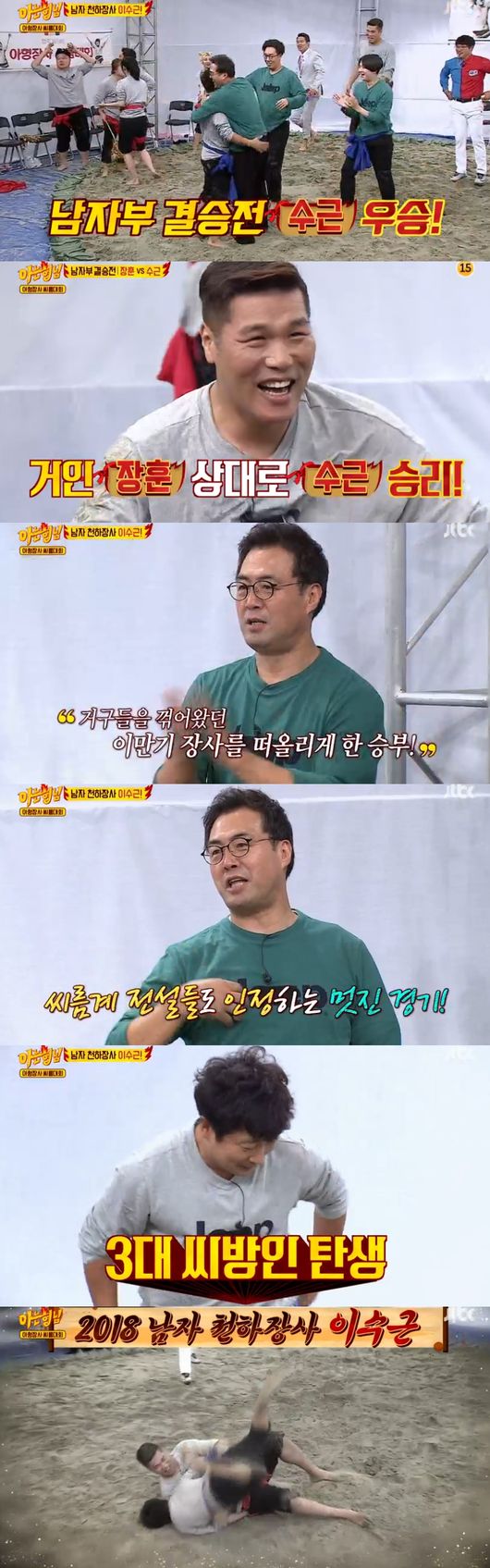 호동팀이 전승했고, 대망의 남자결승이 이어졌다. 천하장사를 건 수근과 장훈이 대결, 이때, 누구도 예상못한 대이변이 일어났다. 거인인 서장훈을 넘기며 이수근이 승리한 것. 양팀을 흥분시킨 엄청난 대결이었다. 43센치란 신장차이를 극복했기 때문. 이만기는 "수근아 사랑한다, 씨름한 내가 봐도 멋있다"라며 박수쳤다.
