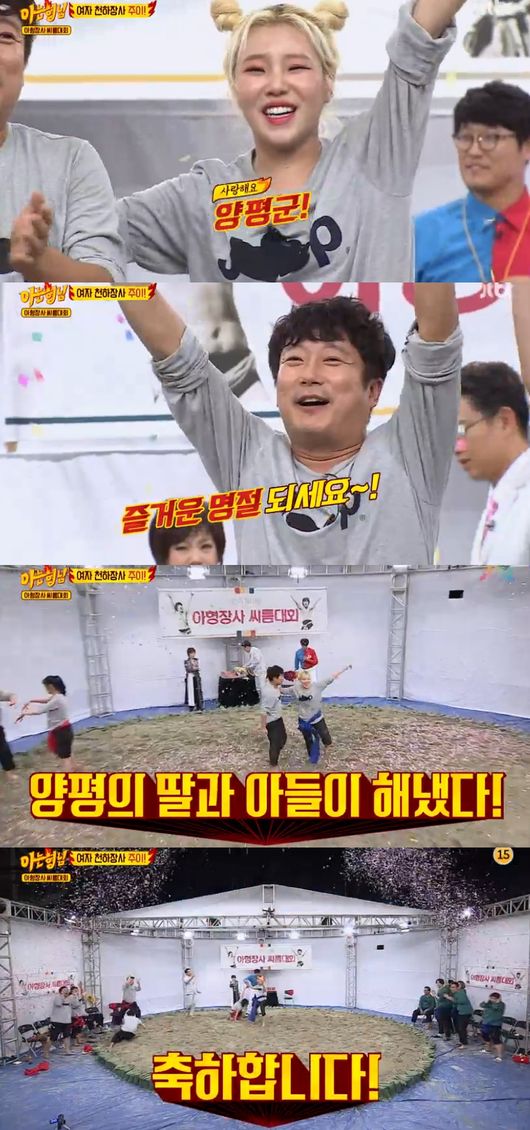 여자 천하장사는 사유리와 사유리의 대결이었다. 사유리의 기습 덧걸이 공격이 들어왔으나, 대치기로 주이가 승리하며 여자 천하장사로 등극했다.남자부 이상으로 엄청난 대결이었다. 두 사람은 "양평의 딸과 아들이 해냈다"고 외쳤다. 양평출신인 쪼꼬미 천하장사 커플이었다.두 사람은 우승 트로피를 받으며 기쁨을 만끽했다.