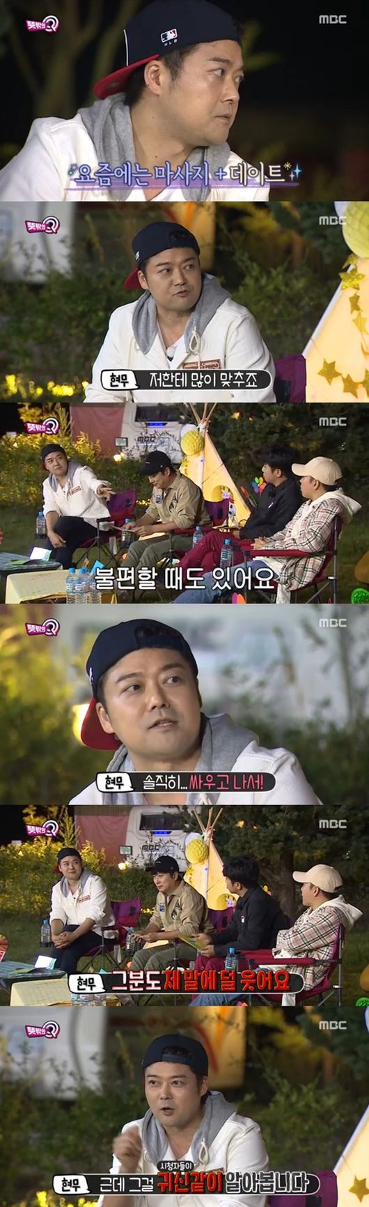 전현무는 쉬는 날에는 무엇을 하냐는 질문을 받고 "전엔 마사지 받으면서 자는 게 유일한 일이었는데 지금은 마사지 받고 자는 것과 데이트다. 여자친구가 나한테 시간을 많이 맞춰준다"고 말하며 여자친구인 한혜진을 언급했다. 그의 여자친구 한혜진 이야기가 나오자 멤버들은 "여자친구와 함께 방송하면 불편한 점 없냐"며 궁금해했다.