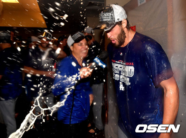 경기 후 클럽하우스에서 만난 커쇼는 맥주세례에 몸이 흠뻑 젖어 있었다. 인터뷰를 진행하는 와중에도 맷 켐프가 와서 커쇼의 얼굴에 맥주를 부으며 축제를 즐겼다.