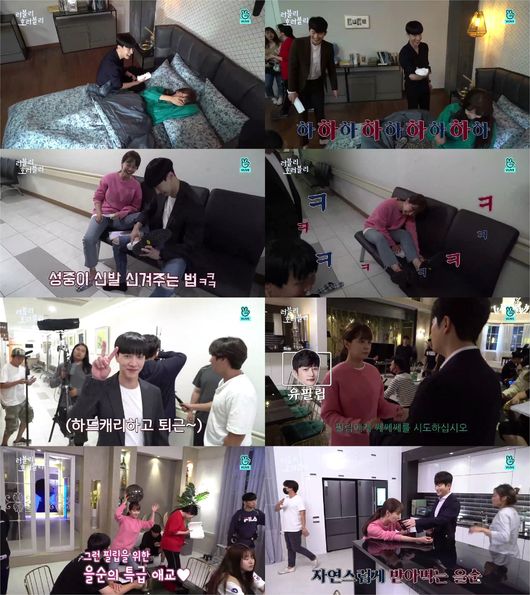 그런 가운데 공개된 영상에서는 진지했던 극 중 상황과는 달리 폭소가 만발한 촬영장 분위기가 시선을 사로잡는다. 눈만 마주쳐도 웃음보가 터지는 박시후와 송지효, 이기광의 모습이 ‘엄마 미소’를 자아낸다. 이기광의 간호를 받으며 아픈 연기를 하던 송지효는 웃음 바이러스에 걸려 폭소를 자아냈다. 이기광이 수건만 갖다 대도 빵 터지는 송지효의 모습에 촬영장은 웃음바다가 됐다. 그런가 하면 성중(이기광 분)이 슬리퍼를 신은 을순에게 자신의 신발을 신겨 주던 달달한 장면의 카메라 밖 현장도 포착됐다. 극 중 직진 연하남의 달달함을 뽐냈던 이기광은 양말을 뒤집어 신은 허당美는 물론이고, 본 방송에서의 로맨틱함 대신 파워풀하게 신발을 신겨 주며 ‘상남자’의 면모를 드러내 빵 터지는 웃음을 선사했다.