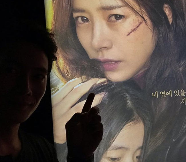 지성은 한지민의 얼굴이 가득 담긴 영화 '미쓰백' 포스터 앞에서 포즈를 취하고 있다. 지성과 한지민은 최근 종영된 tvN 드라마 '아는 와이프'에서 부부 호흡을 맞췄다. 이에 지성이 '명당' 무대 인사 중 한지민의 영화를 발견, 따뜻한 응원의 말을 건넸다.