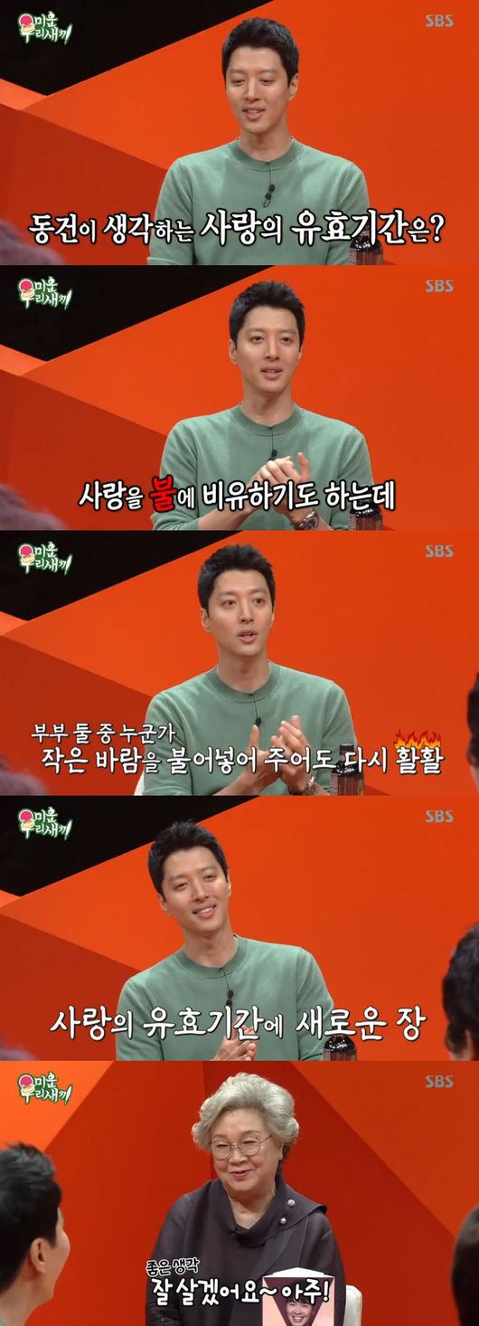 서장훈은 사랑의 유효기간에 대해 물었다. 이동건은 "불꽃이라 비유한다"면서 "결혼해서 매일 보는 얼굴, 불길이 작아지고 불씨가 될수도 있다. 이를 사랑이 식었다고 착각하지만, 누구 한 명이 먼저 사랑을 불어주면 더 활활 커진다"면서 꺼져가는 불씨에 서로가 바람을 불어넣어야한다고 했다. 노력과 정성이 필요하다는 것.