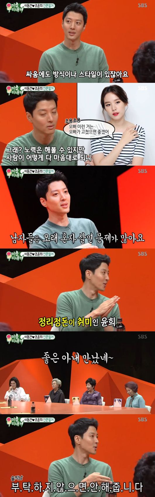 이동건은 "눈치가 좀 없다"며 폭탄 발언, 신혼일기 얘기하던 중 모두 당황하게 했다. 이동건은 "좀 느리다, 삐져도 모를 때가 많다"면서 "오히려 화가 났다가도 눈치없는 윤희덕에 그냥 넘어간다, 예민하게 반응하지않는다"며 오히려 이런 점이 잘 맞는다고 했다.