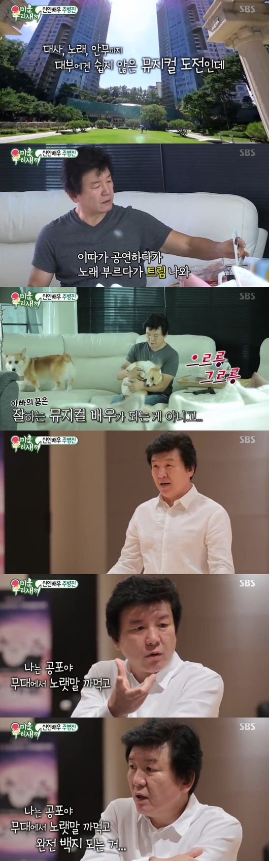 뮤지컬 무대가 익숙치 않은 새싹 배우인 주병진은 잠시 뒤 있을 공연을 위해 목을 풀었다. 주병진은 노래부르다 트림이 나오거나, 배부르면 졸린 탓에 가사를 까먹을 것을 염려해 식사도 걸렀다. 게다가 살을 빼야 노래르 잘하고 춤도 더 잘춘다면서 다이어트를 한다고 했다. 콩가루 하나가 한 끼였다. 주병진은 "완전히 콩가루 집안"이라며 위트도 잊지 않았다.