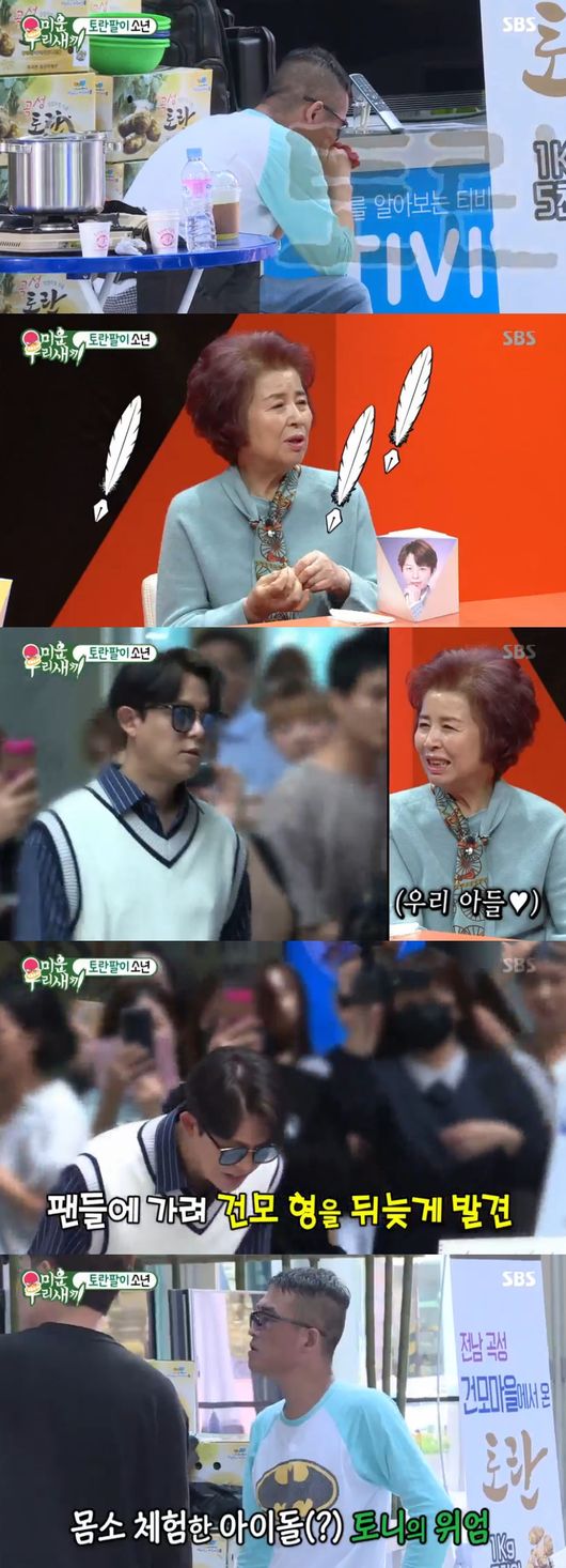 이때, 붐이 지나갔다. 김건모는 붐에게 판매를 맡겼고, 붐까지 나섰다. 김건모는 '토란'만 계속 외쳤다. 갑자기 사람들이 몰려왔다. 토니의 등장이었다. 팬들의 가려 토니가 건모를 보지 못했다. 건모가 토니의 이름을 불렀고, 이를 알아챈 토니가 건모의 토란을 샀다. 이후 건모는 토니를 따라다니는 토니부대 팬들을 보며 부러워했다.