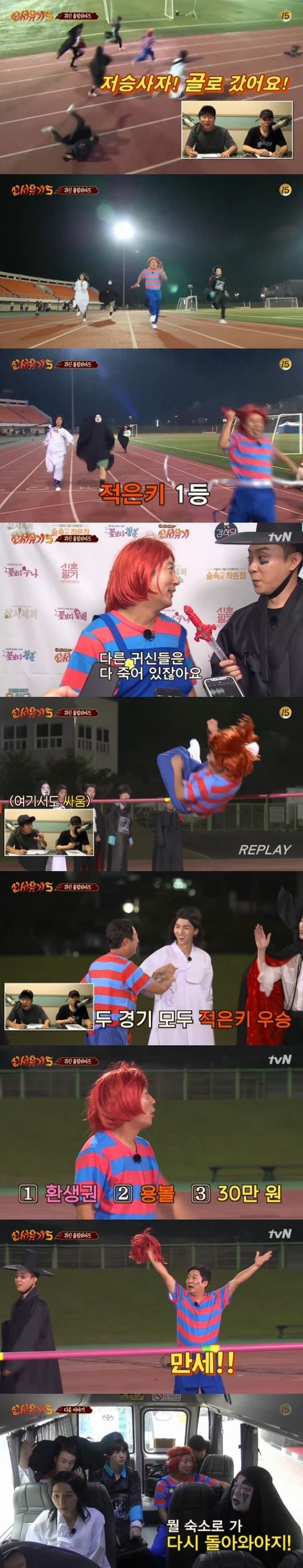 첫번째 경기 100m 달리기에서는 처키 이수근이 빠른 스피드를 이용해 우승을 차지했다. 이수근은 "평소 인간과 많은 교류를 해왔고, 어린 아이들과 같이 놀았다. 다른 귀신들은 다 죽어 있다"며 소감을 말했다.