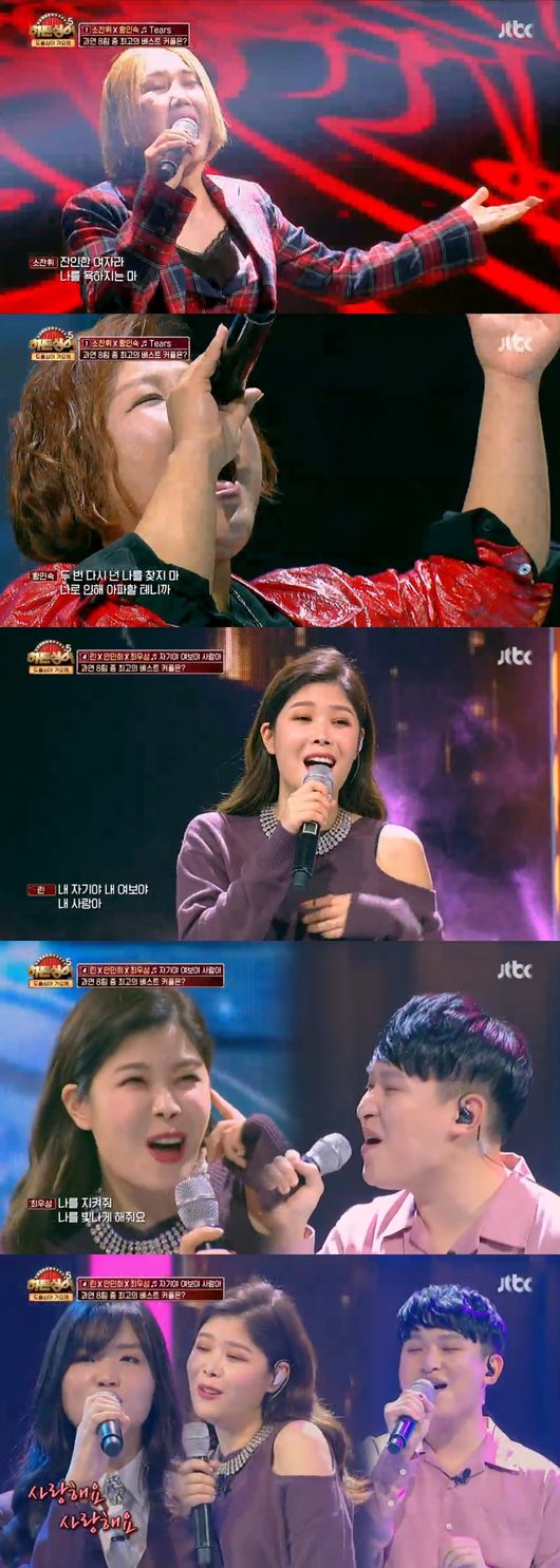 다음 무대도 소찬휘 커플이 꾸몄다. 강력한 고음의 향연으로 시청자들을 이끈 것. 두 사람은 히트곡 ‘tears’를 선곡해 시작부터 객석의 환호를 받았다. 베스트 커플을 향한 소찬휘와 황인숙의 호흡이 돋보였다.