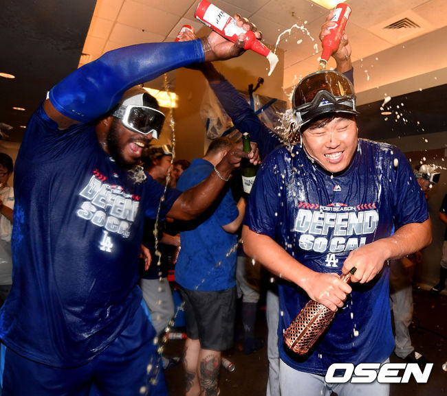 다저스를 대표하는 클레이튼 커쇼와 저스틴 터너도 취재진에게 맥주세례를 퍼부었다. 구석에 숨어있던 류현진은 야시엘 푸이그의 장난에 결국 옷이 맥주로 흠뻑 젖었다. 취재진과 만난 류현진은 “일 년 동안 이거 하려고 선수들끼리 준비했다. 같이 해서 너무 기쁘다. 더 높은 곳까지 올라갈 수 있도록 선수들끼리 남은 기간 잘해야겠다”고 기뻐했다.