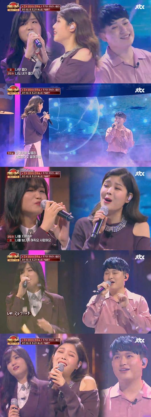 안민희의 출연을 몰랐던 판정단은 성별이 다른 린과 최우성의 목소리를 구별하기 쉬울 거란 생각을 했지만 쉽지 않았다. 여기에 ‘초밥집 린’까지 가세해 의견이 더욱 분분해졌다. 세 사람은 ‘자기야 여보야 사랑아’를 부르며 똑같은 목소리를 다시 한 번 과시했다.