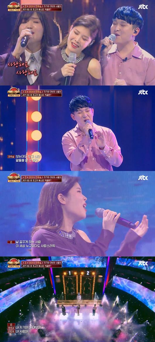 '히든싱어5'에서 또 하나의 놀라운 반전이 이어졌다. 듀엣가요제 특집에서 린과 최우성의 듀엣인줄 알았던 무대가 사실은 초밥집 린 안민희와 최우성의 무대였다. 세 사람이 함께 부르는 '자기야 여보야 사랑해'는 그래서 더 감동적이었다.