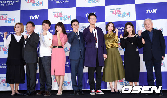 케이블채널 tvN 새 예능프로그램 '따로 또 같이'의 제작발표회가 1일 오전 11시 서울 마포구 상암동 CJ E&M센터에서 열렸다. 제작발표회에는 박미선과 이봉원, 심이영과 최원영, 강성연과 김가온, 최명길과 김한길, 그리고 MC 김국진과 김유곤 CP가 참석했다.