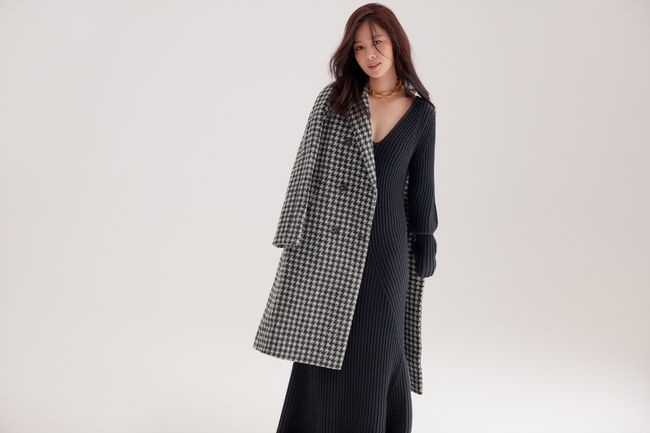 또 다른 화보에서 김현주는 깊게 파인 니트 소재의 롱 원피스에 화이트와 블랙 투톤의 하운드투스 체크 패턴의 코트를 착용해 고급스러운 겨울 패션을 소화했다.