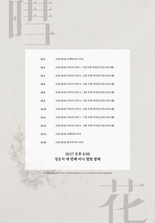 더불어 티저 오픈 일정과 함께 공개된 ‘정은지 세 번째 이야기, [혜화(暳花)] ; 별 반짝이는 꽃, Promotion Schedule, 2018.10.17 18:00’라는 문구가 혜화의 의미와 음반 발매 시점을 공개했다.