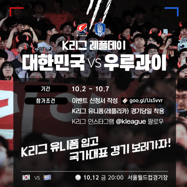 한국프로축구연맹과 대한축구협회는 오는 10월 12일 오후 8시 서울월드컵경기장에서 펼쳐질 대한민국과 우루과이의 국가대표팀 친선경기에 KFAN 무료 초청 이벤트를 준비했다.