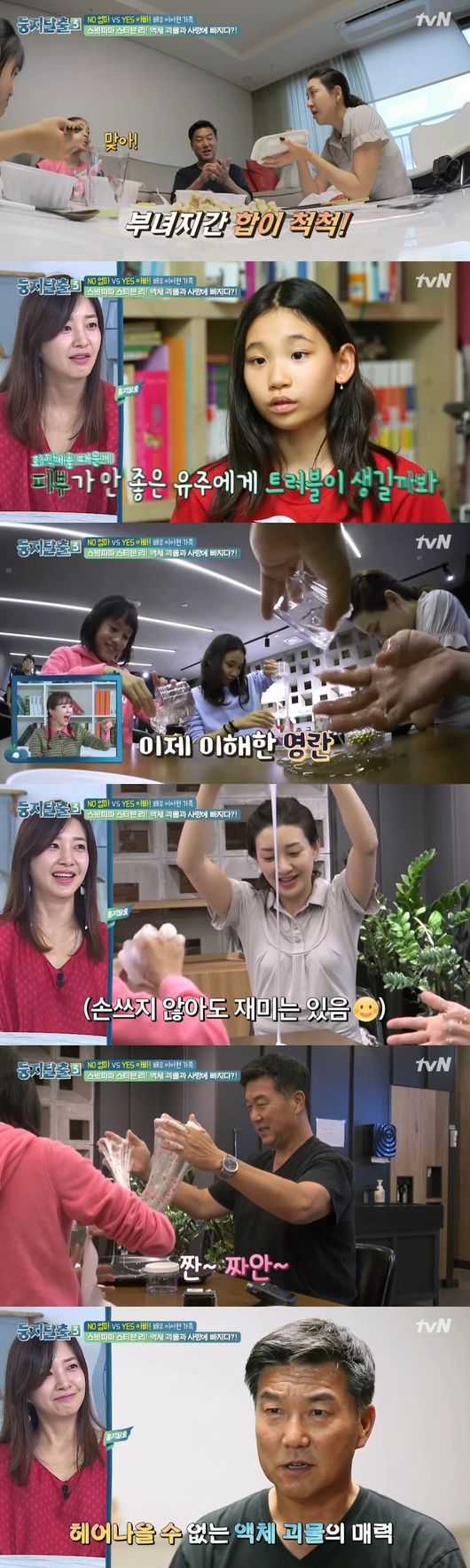 한편 이아현의 가족들은 유주가 가고 싶어 했던 슬라임 카페로 나들이를 갔다. 평소에 슬라임을 금지했던 이아현은 유주가 슬라임 카페에 가고 싶다고 하자 고민에 빠졌다. 결국 슬라임 카페에 간 가족들은 본격적으로 슬라임 만들기에 돌입했다. 유주와 유라는 신나게 가지고 놀았고 슬라임이 손에 닿기 싫은 이아현은 숟가락으로 반죽을 해 웃음을 자아냈다. 하지만 아빠 스티븐리는 예상 외로 아이들보다 더 재미있게 노는 모습으로 폭소케 했다. /mk3244@osen.co.kr