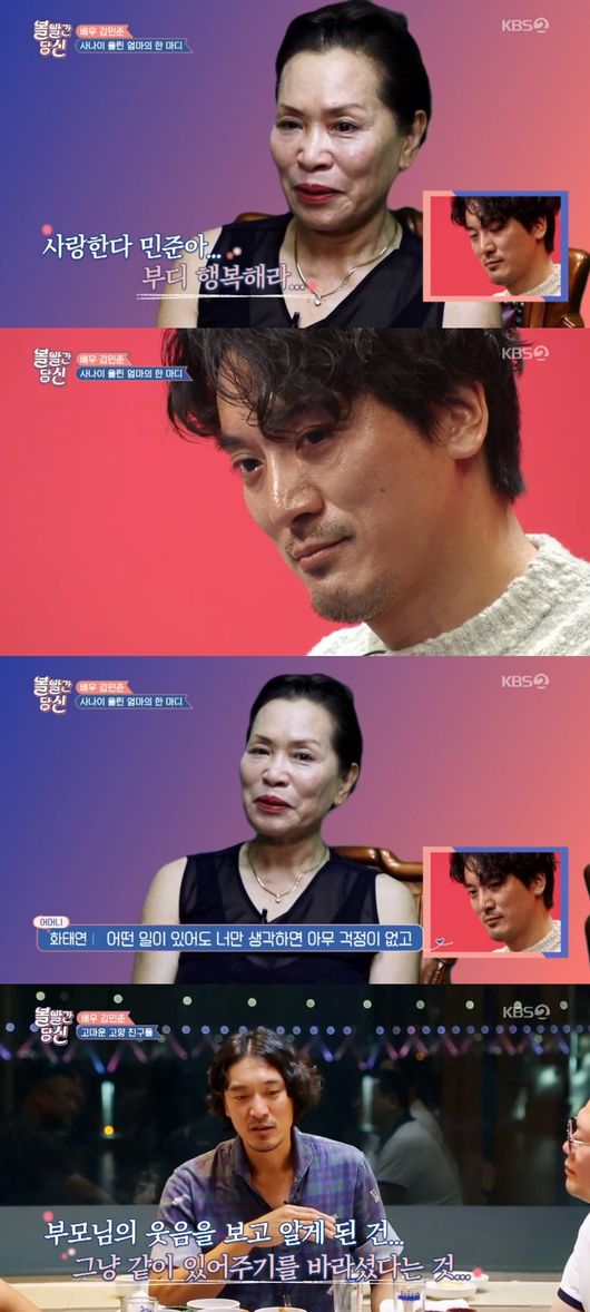 김민준은 "결혼을 걱정하시는 부모님한테 '걱정하지 마세요'라고 말하고 싶었는데, 타이밍을 놓치니까 전화를 피하게 되더라"고 말했다. 이어 "엄마 아빠 예전 사진을 보니까 내가 꼬마일 때 지금 내 나이보다 어리시더라. 진짜 내가 잘못했다는 생각이 든다"며 "내가 가장이니까 집안의 화목은 경제적인 안정감이라고 생각다. 그런데 부모님의 웃음을 보고 그냥 아들이 같이 있어주길 바랐다는 걸 알았다"고 고백했다.