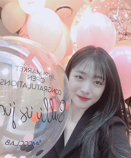 사진 속 설리는 검정 재킷을 입고 풍선을 든 채 카메라를 응시하며 미소짓고 있다.