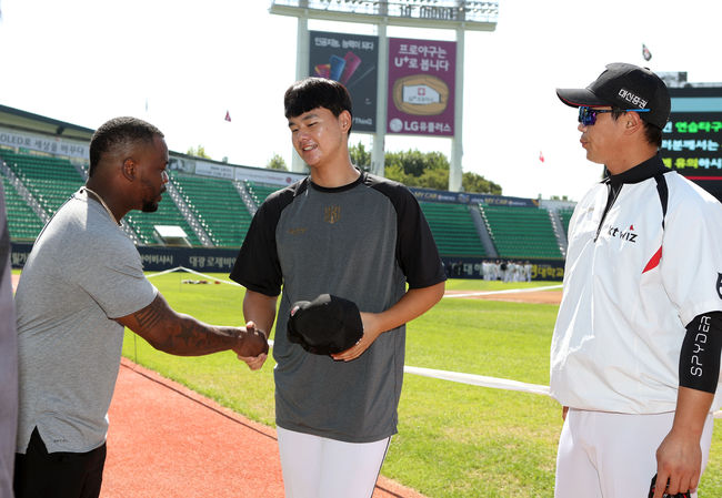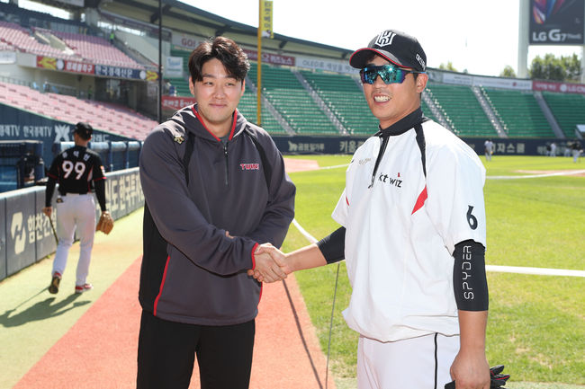3일 KT 선수단이 도착한 뒤 4명이 선수들이 3루측 KT 덕아웃 앞에서 만났다. 이전 LG에서 뛴 박경수는 양석환을 만나 서로 웃는 얼굴로 이야기를 주고 받았다.