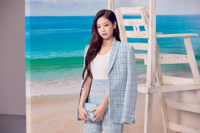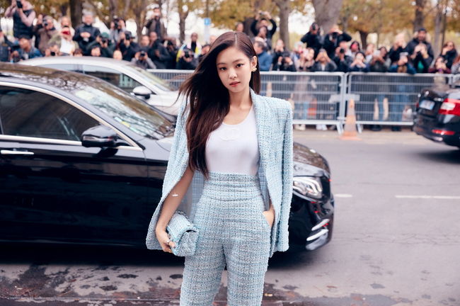 이날 제니는 라이트 블루 색상의 트위드 슈트를 자신만의 색깔로 소화하며 수많은 패션 피플 사이에서도 눈길을 끄는 매력을 과시했다.