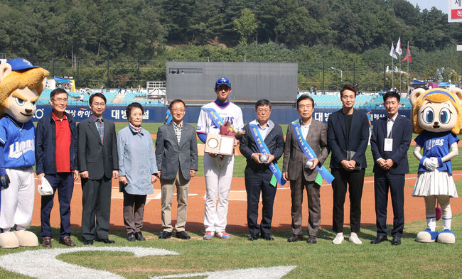 대구지방검찰청 박윤해 검사장은 이날 경기를 앞두고 구자욱에게 학교폭력 방지 홍보대사 위촉패를 전달했다. 또한 대구·경북지역 청소년 가족 1700여명을 초청해 1일 가족이 돼 '범죄로부터 우리아이 지키기 및 내 친구 지킴이' 운동을 전개하며 함께 야구경기를 관람하는 뜻깊은 시간을 마련했다. /what@osen.co.kr