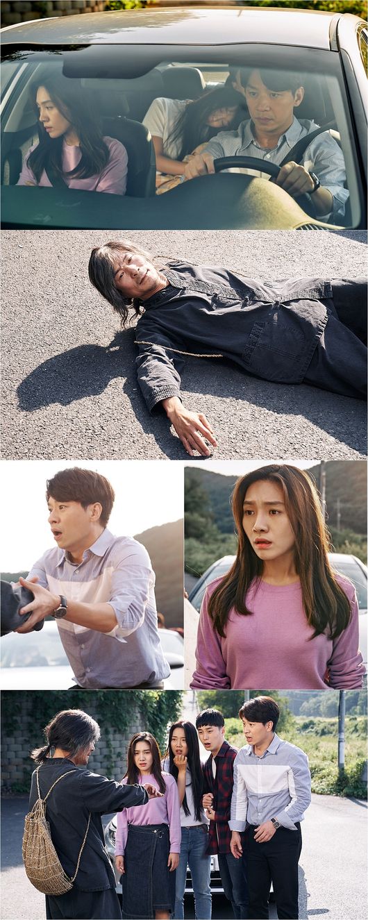 공개된 사진에는 드라이브에 나선 정상훈과 최희서의 모습이 담겨 있다. 뒷좌석에는 꿀잠에 빠진 이름 모를 커플도 함께 포착됐다. 어딘지 어색한 분위기의 두 사람의 표정은 곧이어 벌어질 사건에 대한 궁금증을 더한다. 이어진 사진 속 야인의 비주얼로 등장한 오광록의 모습도 궁금증을 자극한다. 상훈의 차 앞, 대자로 누운 오광록의 깜짝 등장에 동공지진을 일으키는 상훈과 청아의 모습에서 또 어떤 웃픈 상황이 펼쳐질지 벌써부터 폭소를 유발한다.