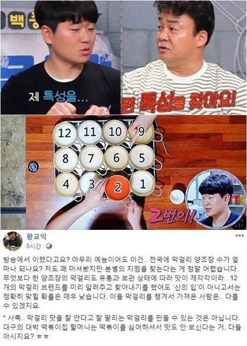 앞서 황교익은 SBS '백종원의 골목식당'을 저격해 문제가 됐다. 그는 지난 2일 자신의 SNS에 "방송에서 이랬다고요? 아무리 예능이어도 이건"이라고 운을 떼며 "전국에 막걸리 양조장 수가 얼마나 되나요? 저도 꽤 마셔봤지만 분별의 지점을 찾는다는 게 정말 어렵습니다"라며 방송에 의문을 제기했다. 이어 "막걸리 브랜드를 미리 알려주고 찾아내기를 했어도 '신의 입'이 아니라면 정확히 맞출 확률은 매우 낮습니다. 이들 막걸리를 챙겨서 가져온 사람은 다를 수 있겠지요"라고 말했다.