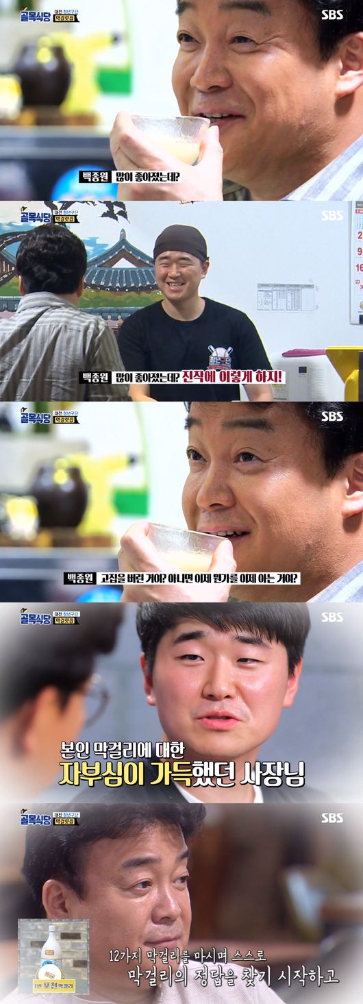 이후 결국 막걸리집 사장이 변화의 모습을 보였다. 이날 방송에서 백종원은 막걸리집 사장의 막걸리를 맛보고 “많이 좋아졌는데? 진작 이렇게 하지”라며 “고집을 버린 거야? 뭔가 알게 된 거야?”라고 했다.