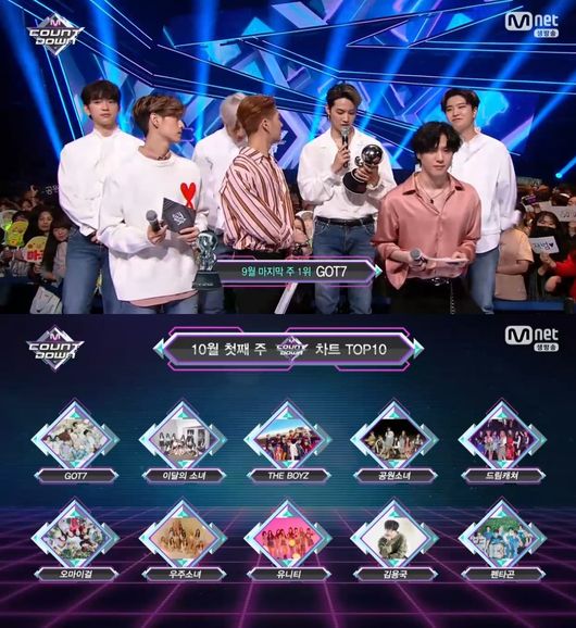 이날 스페셜 MC를 맡은 갓세븐은 "열심히 준비한 앨범인데 좋은 결과까지 있어서 감사하다. 이 기쁨을 아가새 팬들에게 바치겠다"며 지난주 못다 한 소감을 말했다.