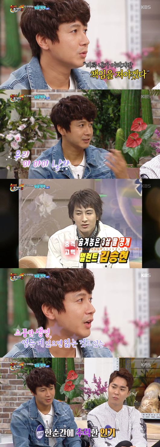 많은 인기를 끌고 있었던 때라 아빠가 됐다는 고백을 하는 것이 쉽지 않았지만 김승현은 용기냈다. 그는 “결과적으로 어린 나이지만 책임을 져야겠다는 생각이 들었다. 아이 엄마도 생명의 소중함에 대해 일깨워줬다. 그래서 낳자고 하고 부모님과 소속사에 말씀드렸다. 부모님은 활동에 지장이 갈까봐 숨기라고 하셨다. 하지만 제 입장에서는 하루 빨리 고백을 하고 떳떳하게 아빠로 서고 싶었다. 일도 중요하지만 가족도 중요하다. 그래서 기자회견을 해서 아이가 있다는 것을 발표했다”고 했다.