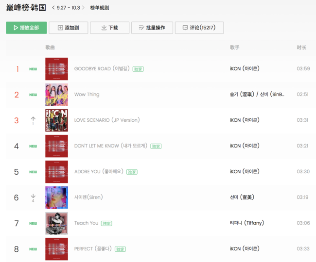 아이콘이 중국 최대 음원사이트 QQ뮤직과 KUGOU뮤직에서 나란히 1위를 기록하며 중화권에서도 높은 인기를 증명했다.