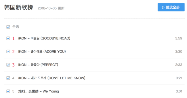 지난 1일 발표한 아이콘의 새 미니앨범 'NEW KIDS: THE FINAL'의 타이틀곡 '이별길'은 중국 최대 음원사이트 QQ뮤직 KPOP 주간차트에서 1위를 차지했다. 더불어 아이콘의 ‘이별길’뮤직비디오 또한 QQ뮤직 KPOP MV 차트에서 1위를 기록했다.