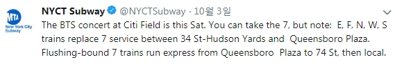 이에 뉴욕 지하철 측은 지난 3일 공식 트위터를 통해 "방탄소년단의 시티필드 콘서트가 6일 토요일 진행된다"며 이날 열차 추가 편성 및 급행열차 운행을 예정하고 있다고 밝혔다.