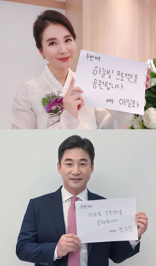 이일화와 전노민은 “하늘빛 프로젝트를 응원합니다”라는 메시지를 들고 찍은 인증 사진을 7일 나란히 공개했다. MBC 일일드라마 ‘비밀과 거짓말’에서 부부로 호흡을 맞추고 있는 두 사람이 선한 마음을 모은 것이다.