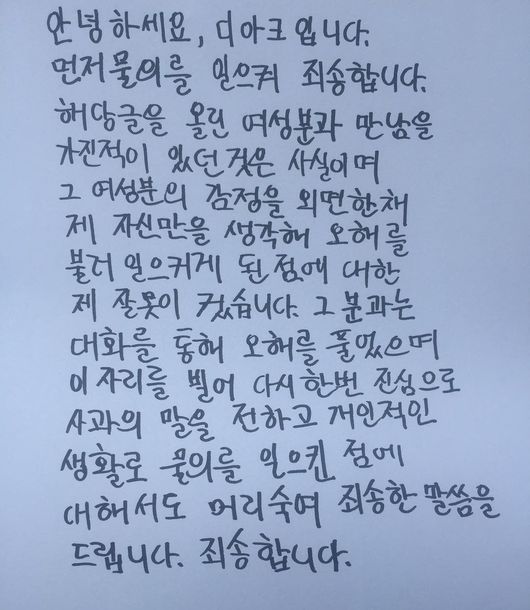 해당 글을 올린 여성분과 만남을 가진 적이 있던 것은 사실이며 그 여성분의 감정을 외면한 채 제 자신만을 생각해 오해를 불러일으키게 된 점에 대한 제 잘못이 컸습니다.