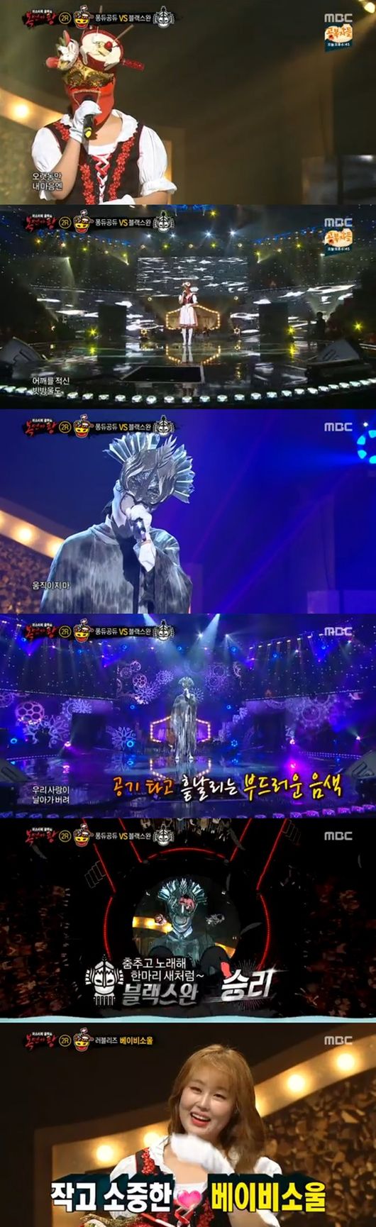 2라운드 두 번째 무대 승자는 블랙스완이었다. 가면을 벗은 퐁듀공듀의 정체는 러블리즈의 베이비소울이었다. 그의 정체에 관객과 연예인 판정단은 모두 깜짝 놀랐다. / yjh0304@osen.co.kr