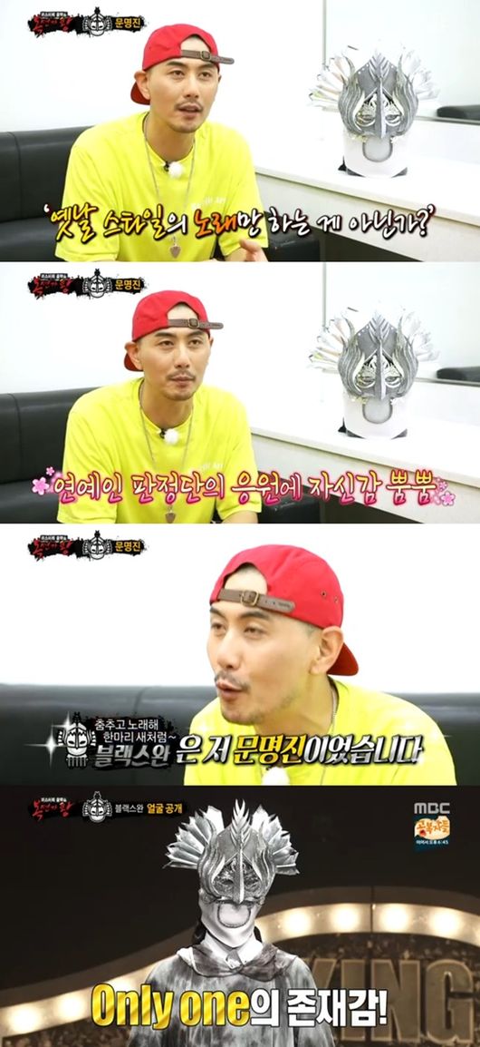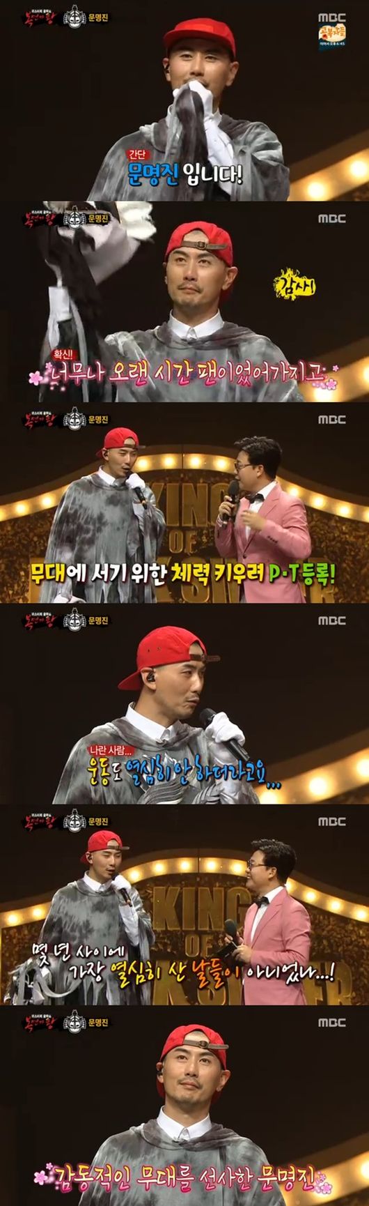 아쉽게 가왕의 문턱에서 가면을 벗게 된 문명진. 연예인 판정단의 한해는 "오랜 팬이었기에 모를 수 없었다"며 문명진에게 박수를 보냈다. 문명진은 "문명진입니다"라며 담백한 인사를 보내며, 허당기 다분한 개인기들처럼 어딘지 맥 빠지는 허당미를 발산해 관객들을 웃게 했다.