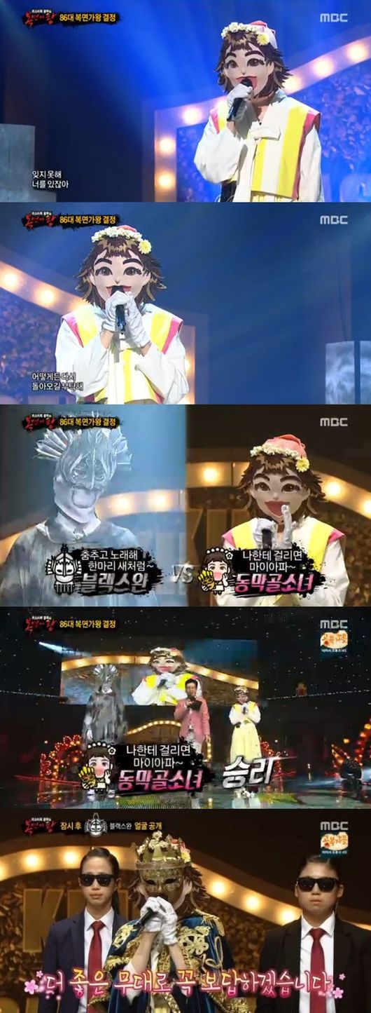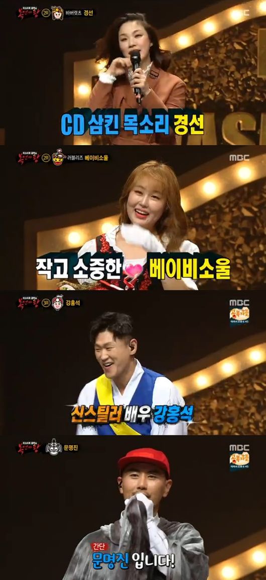 지난 7일 오후 방송된 MBC 예능 프로그램 '복면가왕'에서는 5연승에 도전하는 동막골소녀에 맞서는 4인의 복면가수들의 모습이 그려졌다. 이날 정체를 공개한 복면가수는 '추녀' 바버렛츠 경선, '퐁듀공듀' 러블리즈 베이비소울, '사물놀이소년' 강홍석, '블랙스완' 문명진이었다.