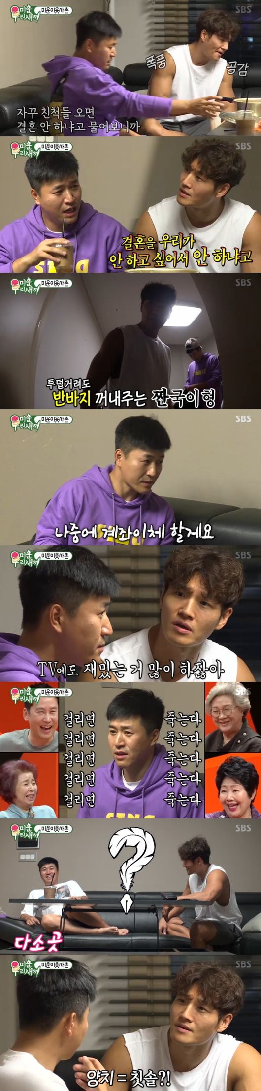 김종국은 "너희 집가서 봐라"고 했다. 김종민은 "친적들이 또 결혼얘기 한다"며 불쌍모드로 변신, 김종국은 "결혼을 우리가 안하고 싶어 안하냐, 못하는 것"이라면서 "좋은 사람이 나타나야할 거 아니냐, 나를 좋아하거나"라며 공감했다.