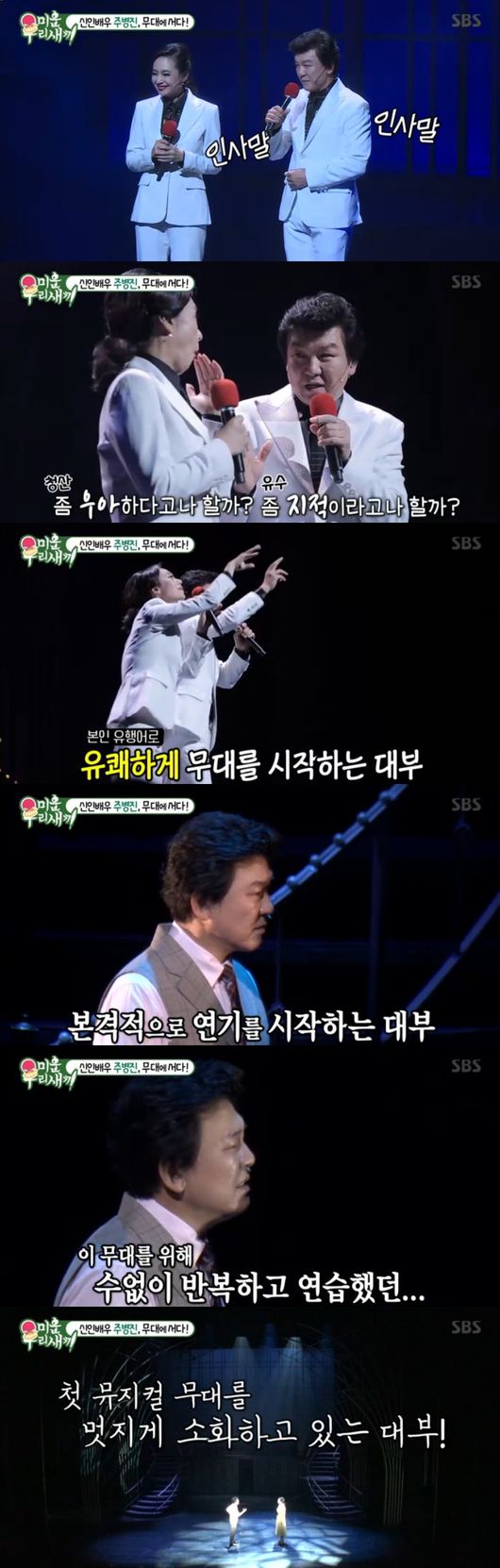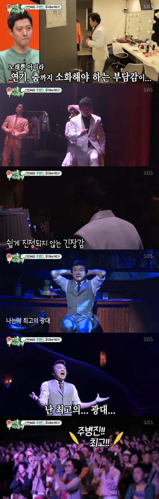 다음은 미우새의 대부, 주병진이 무대를 준비하는 모습이 그려졌다. 신인 뮤지컬배우로 내딛는 첫 걸음이었다. 에너지 넘치는 파이팅 콜을 마치고 객석을 가득채운 관객들 앞에 섰다. 41년차 신인배우 대부 주병진이 실수 없이 공연을 잘 마칠지 모두 주목했다. 주병진은 "안 서던 무대라 청심환 먹고 올라갔다"면서 마치 처음 데뷔할 때와 같은 긴장감으로 다시 한번 안무를 체크했다. 뮤지컬 배우들의 기를 받으면서 멋지게 등장했다. 자차공인 명 MC답게 명품 진행솜씨로 분위기를 이끌어갔다. 덕분에 박수갈채가 이어졌다.